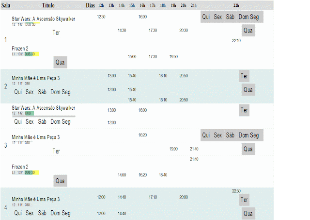 Cinemark Rio: 26/12/2019 a 01/01/2020 Programa Cinesom/ Cabine de Cinema (E.E.) dezembro 27, 2019 0 Comment "Mulheres no Poder" cinemark cinemas programação 26 dezembro de 2019 a 01 de janeiro de 2020 ESTREIAS – 26/12: Minha Mãe É Uma Peça 3 - Paris Filmes; Cats | Cats Universal Pictures; Minha Irmã de Paris | Ni une ni deux - Pagu Pictures *Programação das estreias sujeita a disponibilidade por praça.Abaixo segue a grade horária de programação 52 a 26/12/2019 a 01/01/2020 Fonte: Cinemark/ Atômica SHARE THIS